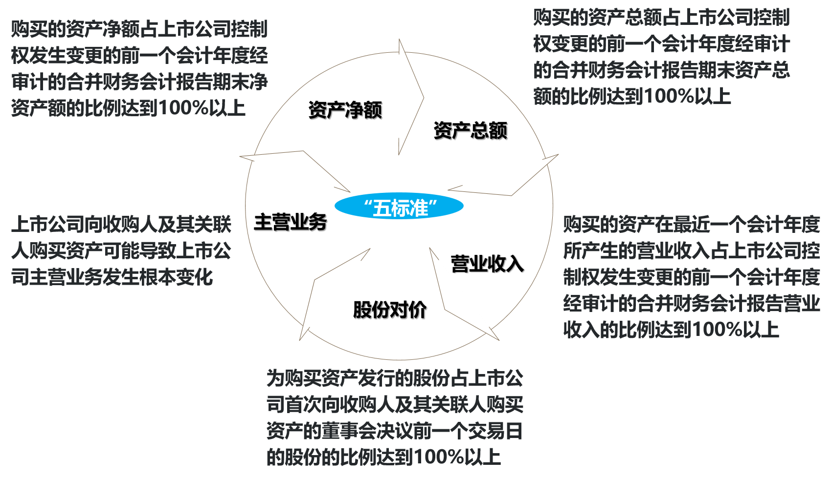 投资机构参与并购重组交易,需关注特定交易是否构成《重组管理办法》项下的“重组上市”(即“借壳”)。根据《重组管理办法》,重组上市需满足以下条件:(1)上市公司控制权变更或变更后36个月内;(2)在(1)的期间内,资产注入满足“五标准”,即: