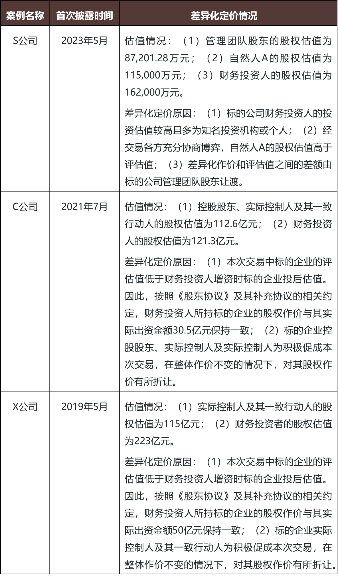 此外,投资机构在投资时,其取得的股权/股份存在一定的优先权利,且对价通常比管理层或原始股东高,因此,是否存在同股不同价的交易安排,我们理解该等估值博弈可以结合具体交易方案进行确定,但总体合理性方面需要结合投资机构承担的义务、锁定期长短、估值及投资成本等因素论证。近期并购重组案例中,存在差异化定价的情况如下: