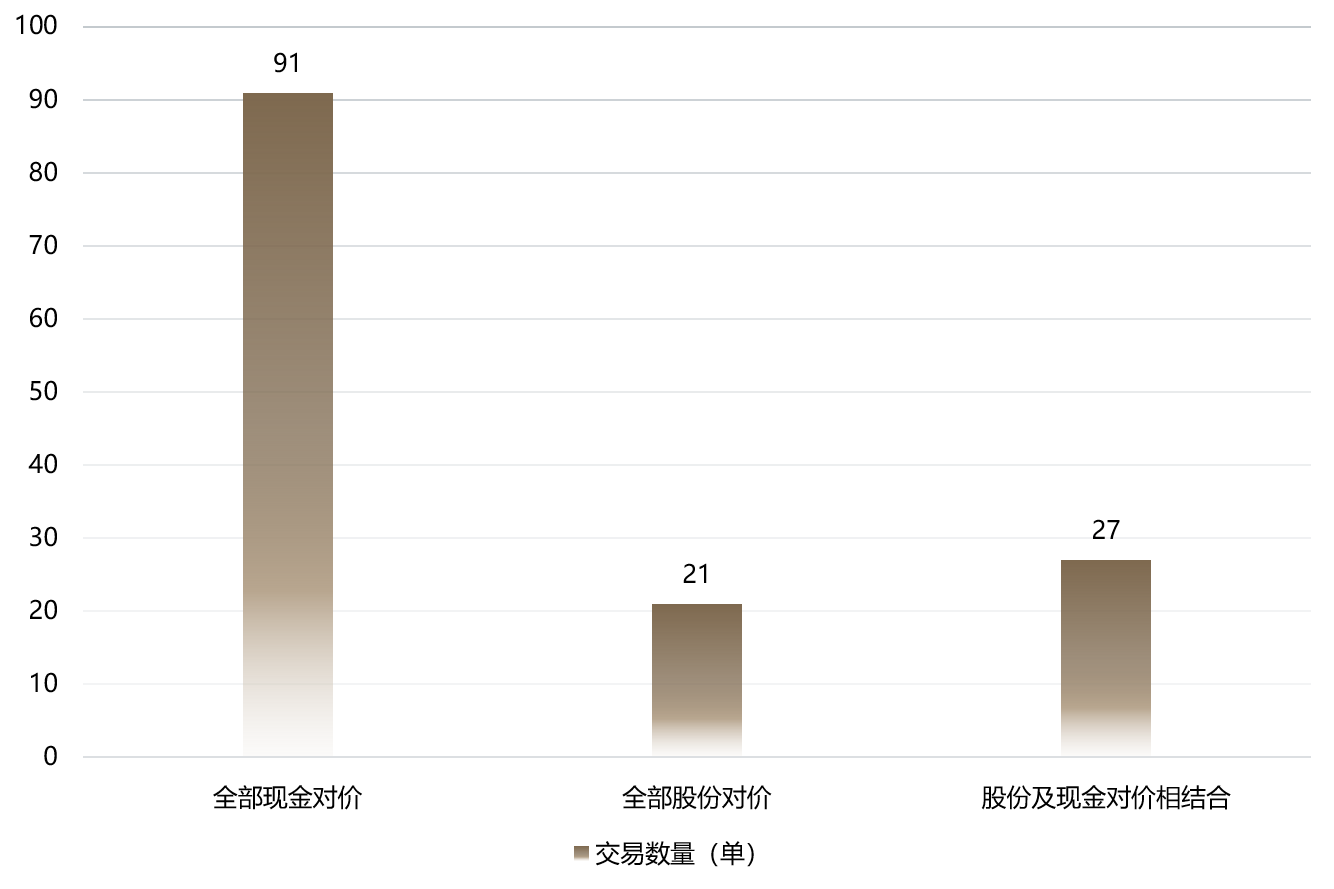 上市公司重大资产重组的交易对价支付方式可以是全部现金对价、或者全部股份对价,或者股份及现金对价相结合。根据我们在公开渠道的粗略统计,在2023年度首次披露重组报告的重大资产重组案例中,交易对价支付方式的粗略统计情况如下 :