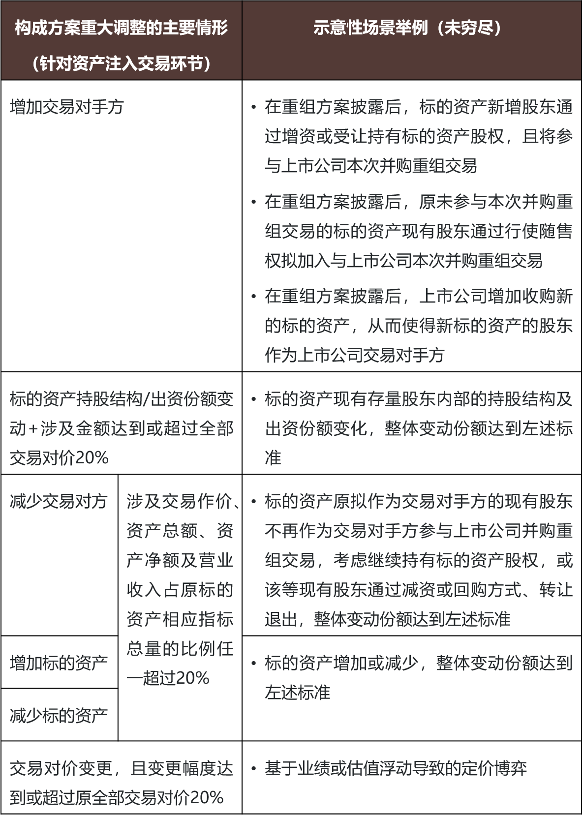 根据《<上市公司重大资产重组管理办法>第二十九条、第四十五条的适用意见——证券期货法律适用意见第15号》(“《适用意见第15号》”)的规定,重组方案中重大调整的情形主要包括: