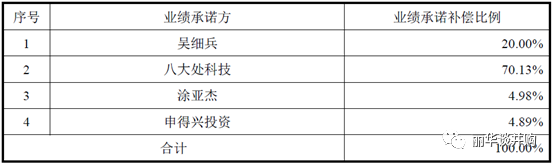 吴细兵、八大处科技、涂亚杰、申得兴投资需承担业绩补偿,其分别持有标的公司股份比例为40.57%、31.22%、3.97%、3.89%,合计持股比例为79.65%,其业绩承诺补偿比例依次为20.00%、70.13%、4.98%、4.89%,合计补偿比例为100%。