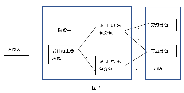 按照该意见,图2阶段一中(1.2)设计施工总承包单位对于自己不具有资质的设计或施工部分可以择优分包给具有相应资质的企业属于合法转包行为。