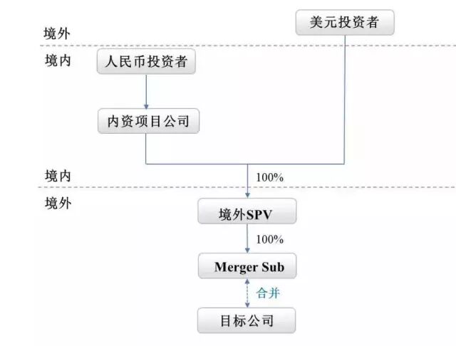 买方团中的人民币投资者在境内设立一家内资项目公司并将人民币资金归集在该实体,买方团中的美元投资者在境外设立一家离岸公司并将美元归集在该离岸公司。之后,内资项目公司在办理了有关的境外投资行政程序后,即可将人民币资金换汇汇出并投资到离岸公司,从而成为离岸公司的股东并完成全部收购资金在境外的归集。后续,买方团通过该离岸公司归集的资金对收购主体进行注资,并进而通过收购主体完成对目标公司的私有化收购。具体图例如下: