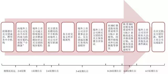 在实践中,美国上市公司私有化方式包括“一步式合并”、“两步式合并”和“反向股份分割”(Reverse Stock Split)等多种方式。其中,“一步式合并”是最为直接的私有化方式,也是目前多数中概股公司常用的方式。通常而言,在采用“一步式合并”方式的跨境私有化并购交易中,其主要流程及时间表如下: