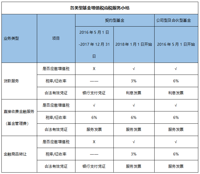 针对上述基本的应税服务类型,公司型、合伙型基金与契约型基金在增值税处理方面:
