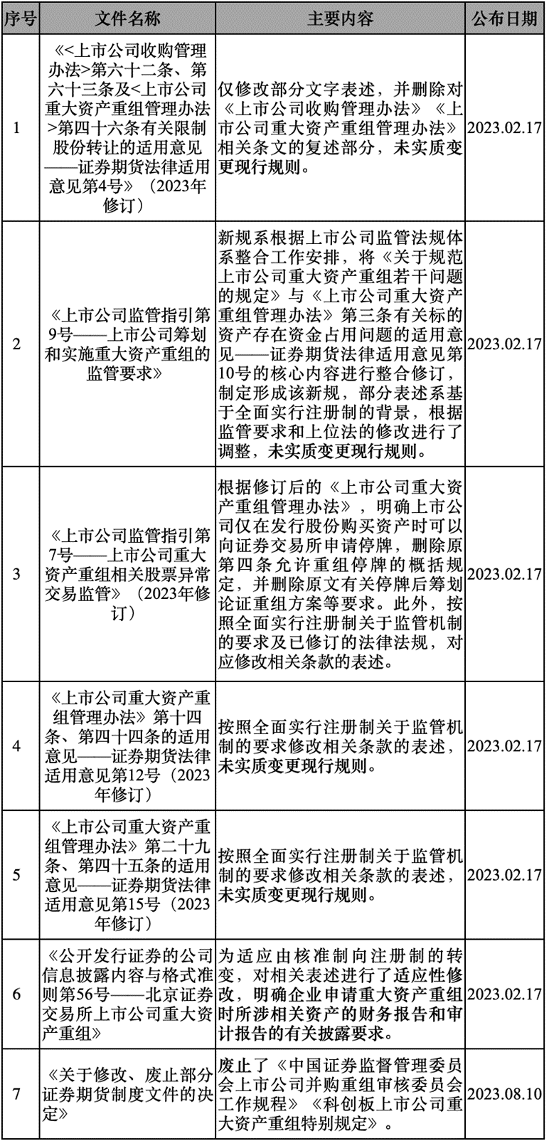 证监会层面,自2023年1月1日至本法规综述出具之日,合计出台10项与并购重组直接相关的规定,其中重点对《上市公司重大资产重组管理办法》《公开发行证券的公司信息披露内容与格式准则第26号——上市公司重大资产重组》进行了修订,并出台了《上市公司向特定对象发行可转换公司债券购买资产规则》,相关规定变化具体分析如下:(一)《上市公司重大资产重组管理办法》(2023修订)《上市公司重大资产重组管理办法(2023修订)》(以下简称“《重组管理办法》”)重点对上市公司重大资产重组的认定标准、发行定价、审核流程等进行了修订。《重组管理办法》在原《重组管理办法》第十二条规定的重大资产重组认定标准“购买、出售的资产在最近一个会计年度所产生的营业收入占上市公司同期经审计的合并财务会计报告营业收入的比例达到百分之五十以上”中,增加了“且超过五千万元人民币”的要求。此外,本次修订后的《重组管理办法》将上市公司发股购买资产与上市公司发股再融资的定价标准保持了一致。本次新规明确,上市公司以发行股份方式购买资产的,发行股份的底价由“不得低于市场参考价的百分之九十”调整为“不得低于市场参考价的百分之八十”。前述修订也实现了主板、科创板、创业板的标准统一。我们理解前述修订实质上放宽了对重大资产重组的认定标准,这将使部分此前可能会被认定为重大资产重组的交易,变为上市公司的一般资产交易行为,而无需履行重大资产重组的相关程序。这样将大幅降低部分交易在审议程序、信息披露、监管审核等方面的成本。上市公司为购买资产所发行股份的底价从市场参考价的九折调整为八折,也将进一步扩大重组交易各方博弈空间。除前述主要修订外,新规还对重组审核和注册流程、事中事后监管、重组信息管理等内容进行了修订。(二)《公开发行证券的公司信息披露内容与格式准则第26号——上市公司重大资产重组》(2023年10月修订)2023年2月修订的《公开发行证券的公司信息披露内容与格式准则第26号——上市公司重大资产重组》(以下简称“《26号准则》”)规定,经审计的最近一期财务资料在财务报告截止日后6个月内有效,特别情况下可申请适当延长,但延长时间至多不超过1个月。从发股类重组项目的实践情况看,上述有效期偏短,确有必要适当延长以提高重组效率。2023年10月修订的《26号准则》对此作出如下调整:1. 明确发股类重组项目财务资料有效期特别情况下可适当延长,延长时间至多不超过3个月;2. 明确发股类重组项目财务资料有效期延长的配套措施:(1)经审计的交易标的财务报告的截止日至提交证监会注册的重组报告书披露日之间超过7个月的,上市公司应当补充披露截止日后至少6个月的财务报告和审阅报告,并在重组报告书中披露财务信息和主要经营状况变动情况;(2)独立财务顾问应当就交易标的截止日后财务状况和经营成果是否发生重大不利变动及对本次交易的影响出具核查意见。修订后的《26号准则》有助于上市公司加快重组进程、降低重组成本、提高重组效率,支持上市公司通过重组提质增效、做优做强。(三)《上市公司向特定对象发行可转换公司债券购买资产规则》(2023年11月14日发布实施)2014年3月,国务院发布《关于进一步优化企业兼并重组市场环境的意见》(国发[2014]14号),首次明确允许将定向发行可转换债券作为符合条件的企业兼并重组的支付方式。2014年10月,证监会修订《上市公司重大资产重组管理办法》,明确上市公司可以向特定对象发行可转换债券、定向权证用于购买资产或者与其他公司合并。2018年11月,证监会发布《证监会试点定向可转债并购支持上市公司发展》,明确将积极推进以定向可转债作为并购重组交易支付工具的试点。赛腾股份(603283.SH)当月即公告预案,成为A股首家以定向可转债作为支付方式之一进行并购重组的上市公司。此后,中国动力(600482.SH)发布发行股份和可转债及支付现金购买资产并募集配套资金的预案成为继赛腾股份定向可转债并购之后首例定向可转债用于“支付对价+配套融资”的案例。但长期以来,定向可转债并没有一个专门的文件进行规范,上市公司发行定向可转债购买资产长期参照、结合《上市公司重大资产重组管理办法》《上市公司证券发行管理办法》(后被《上市公司证券发行注册管理办法》废止)和《可转换公司债券管理办法》的相关规定执行。《上市公司向特定对象发行可转换公司债券购买资产规则》(以下简称“《定向可转债重组规则》”)全文共十七条,其对适用原则、发行条件、定价机制、存续期限、限售期限、回售和赎回、投资者适当性、权益计算、信息披露等内容做出了规定。上市公司可单独以定向可转债作为支付工具,自行决定重组交易对价全部由定向可转债支付或者搭配部分股份、现金支付。上市公司发行定向可转债实施重组需同时符合重大资产重组、公开发行公司债券、向特定对象发行新股(转股股份来源于回购的除外)等多重条件。此外,上市公司发行定向可转债募集部分配套资金的,审议程序、发行条件、发行对象、募集资金使用、转股价格、限售期限等应当符合《上市公司证券发行注册管理办法》的相关规定。《定向可转债重组规则》的实施,补齐了上市公司发行定向