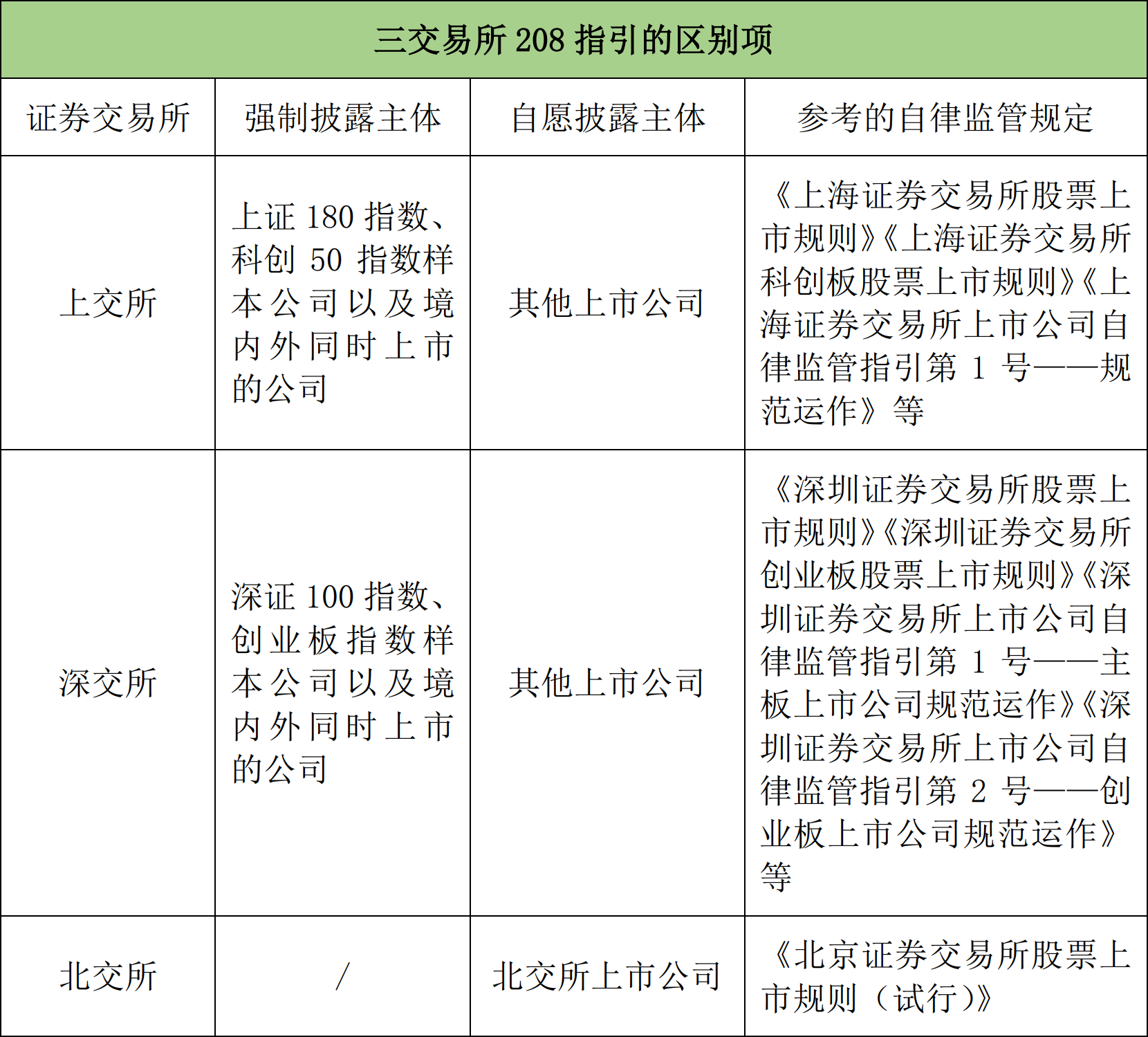 208指引均为六章五十八条的体例,第一章(总则)和第二章(可持续发展信息披露框架)为一般要求,第三章、第四章、第五章分别为环境、社会、公司治理三个维度的具体披露要求,第六章为附则和释义。208指引的内容基本相似,在具体的披露主体、披露的强制性及自愿性、参考的交易所自律监管指引文件等方面,结合各交易所的情况有一定调整。