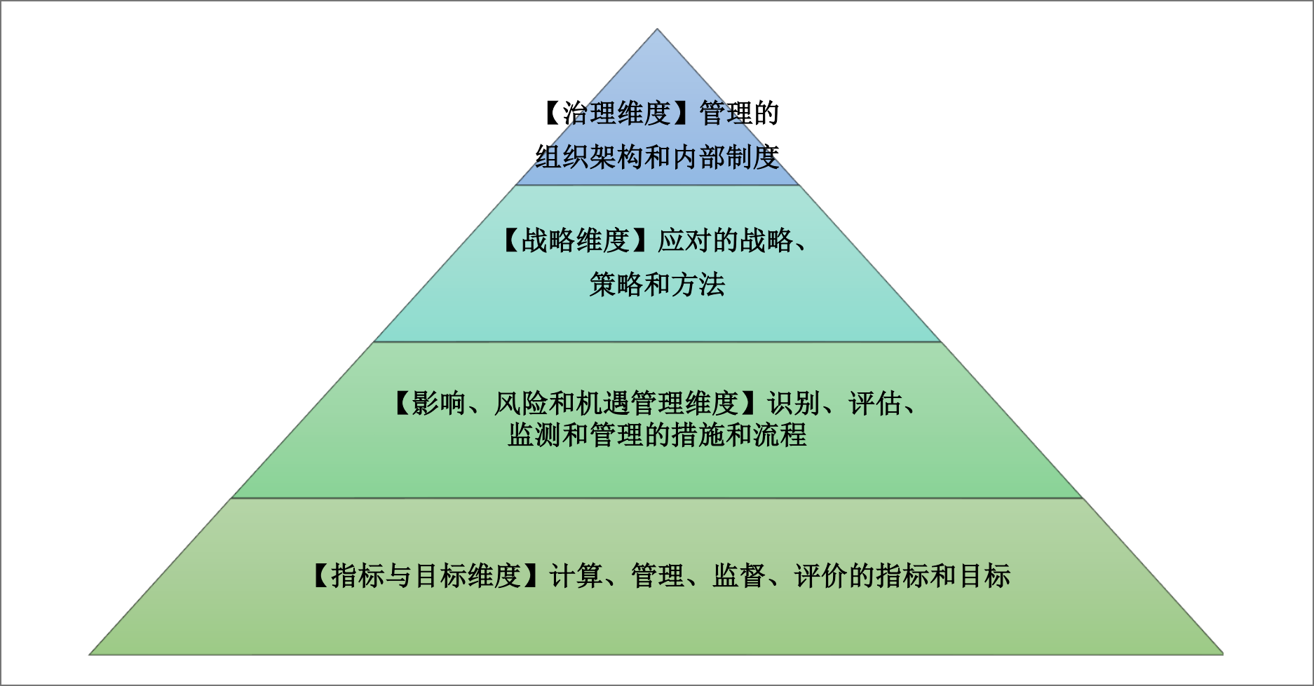 ESG治理体系是指企业围绕重要议题的管理,对应将ESG治理理念和各项治理机制融入企业的组织架构、内部制度、控制措施和程序、人员管理等企业经营管理的方方面面。