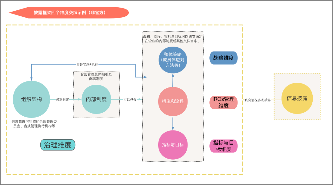 四个维度交织配合,共同作用于企业ESG治理。只有拥有较高层级的治理架构,才能确保各项政策制度得到有效制定、推行、实施和监督,并从最高管理层层面将ESG治理战略、治理措施和流程、治理指标和目标等通过相关政策文件进行明确和颁布,从而一方面切实推动企业重要议题IROs管理落地,一方面推进ESG治理体系从上至下得到遵循、实施、完善和改进提升,进而为ESG信息披露提供充分的支持。