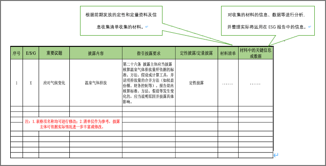 其次,建议企业带着定性定量工具分析208指引的规定,进一步明确每个议题要求披露的细化事项是什么,以及需要准备什么类型的数据/材料,支持报告的分析、说明与披露工作。企业可以根据自身实际情况,编制如下类似清单工具,总结208指引对于E、S、G三个方面重要议题的具体披露事项和要求分别有哪些,并结合定性和定量资料及信息收集清单统计的情况,按照“填空”加“分析”的方式,梳理内部资料、信息和数据,并根据208指引开展ESG报告起草工作。