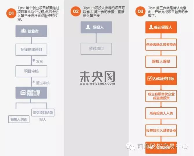 从实践来看,目前中国的股权众筹平台大多采用合投模式。最具代表性的是天使汇AngelCrunch。天使汇甚至联合了多家机构,共同发布了《中国天使众筹领投人规则》,建立了完善的”领投+跟投”机制,比如规定了领投人和跟投人的责任、权利、义务,同时也规定了领投规则和平台方天使汇的服务等。下图显示了天使汇股权众筹的投资流程。