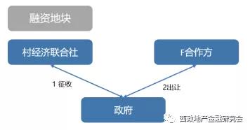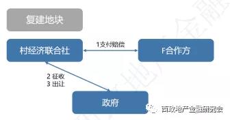 E村经济联合社通过“三资平台”招标方式公开选取合作企业(F合作方),完成地上房屋拆迁和转为国有建设用地手续后,F合作方以协议方式取得“融资地块”、并承担“复建地块”的安置房建造,复建地块由政府划拨给村经济联合社。复建地块上的安置房建设完成后,整体确权给村经济联合社,村经济联合社按照之前的征地补偿协议将安置房过户到村民名下,如果涉及村民补差价的,村民直接支付给开发商。