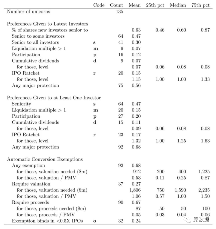 在斯坦福大学研究的独角兽样本库中,超过三分之二的样本,给予了最近一轮投资者一个或多个重要保护:有9只独角兽给予了所有最近一轮投资者超过1倍的优先清算倍数,最高的倍数高达20倍;有16只独角兽给予所有最近一轮投资者参与分配权,27只至少让他们的一位投资者拥有参与分配权;有20只独角兽给予了最近一轮投资者IPO棘轮条款;有92只独角兽给予了最近一轮投资者自动转换豁免权;有41只独角兽给予了新投资者对所有现有股东都更为高级的等级(Seniority)。