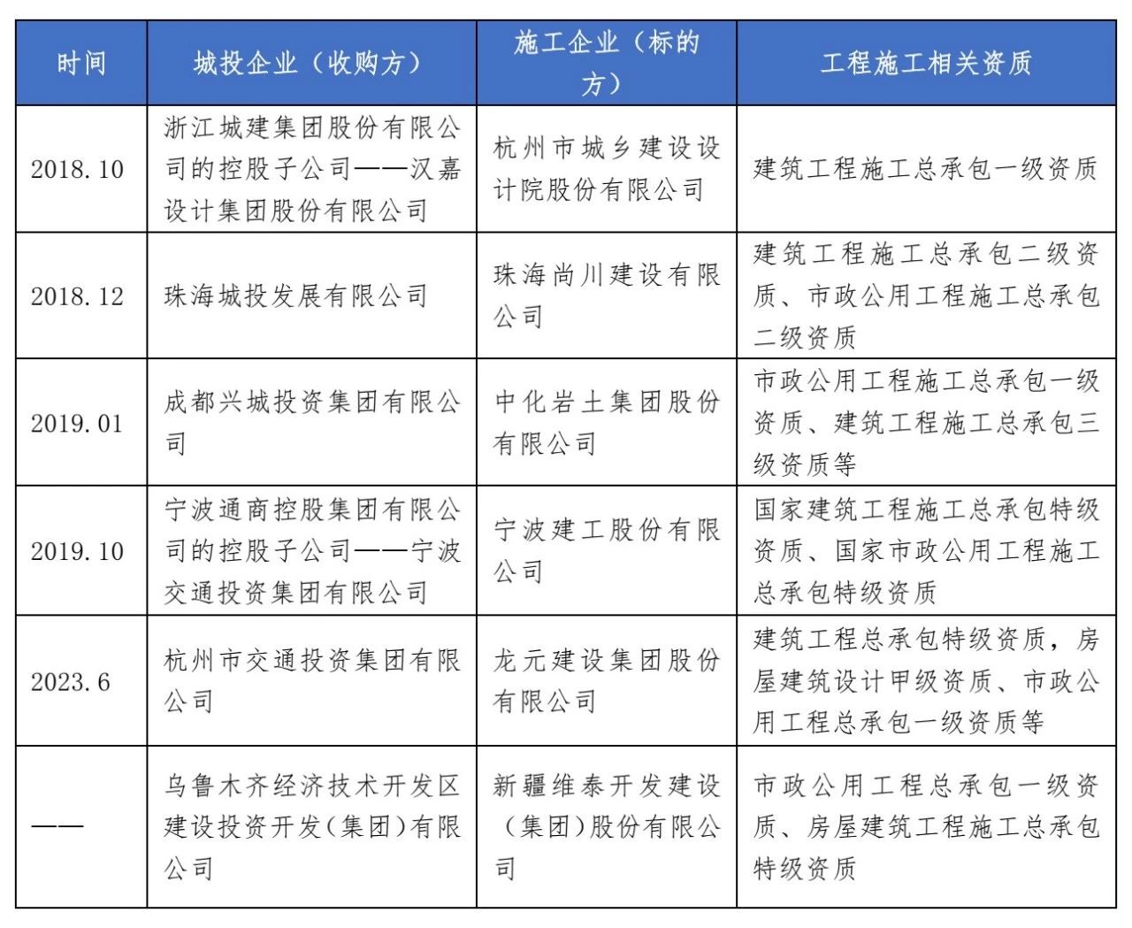 标的企业原则上要求具有工程施工总承包一级及以上资质,注册地为城投公司所在区域范围内或邻近区域,或者承诺收购(控股)后将企业总部搬迁至既定区域的成建制建筑施工企业,具备专业的管理团队和稳定的市场化业务支撑,并购后能与城投公司在业务、组织、人员等方面产生协同效应。