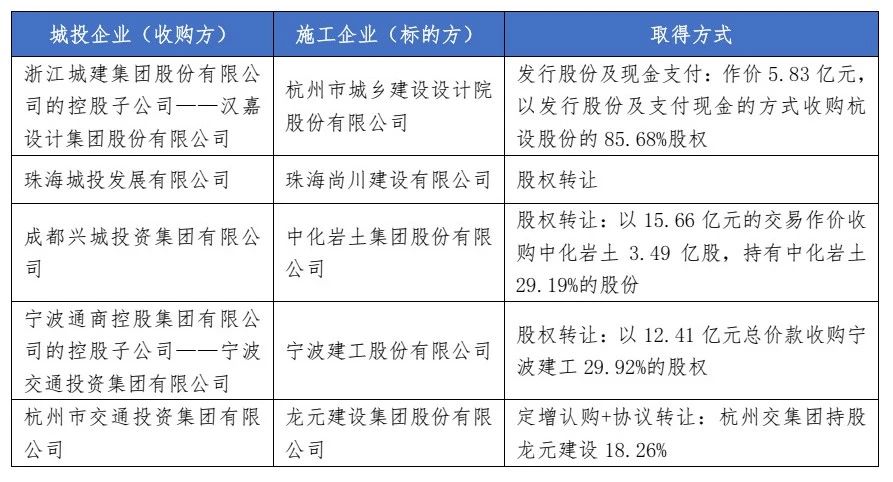 另外,股权收购案例中,分为城投母公司直接实施收购、城投公司通过下属控制子公司实施收购。例如,浙江城建集团股份有限公司通过其控股子公司——汉嘉设计集团股份有限公司,收购杭州市城乡建设设计院股份有限公司的85.68%股权。