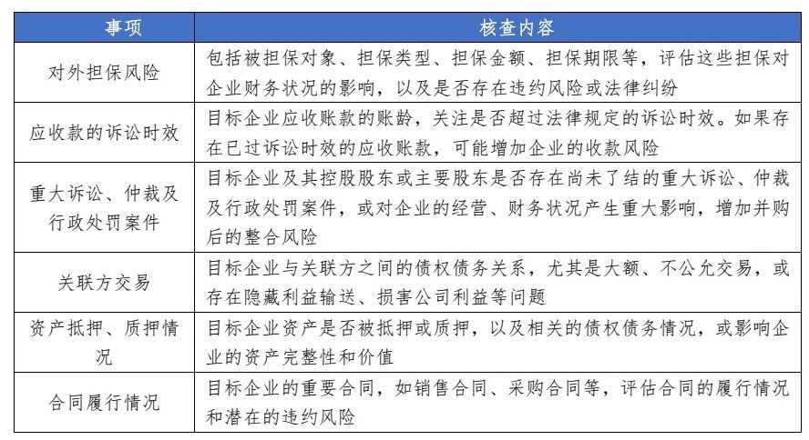 建筑施工企业的财务状况。财务尽职调查内容主要包括:(1)目标企业历史和概况,即目标企业基本情况、财务组织构建以及会计、薪酬、税费等政策情况;(2)企业财务报表,具体包括资产负债表、利润表和现金流量表,以此来评估目标企业的盈利能力、偿债能力和运营效率等;(3)重大债权债务及或有负债,特别关注目标企业对外担保的风险、应收款的诉讼时效以及实现的可能性,目标企业的诉讼、仲裁或行政处罚事实存在尚未了结的或可预见的重大诉讼、仲裁及行政处罚案件等。