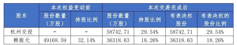 收购完成后,杭州交投集团预计将持有上市公司总股本的29.54%,赖振元家族持股18.26%,新旧大股东持股比例差距在10%以上。