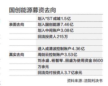 在此后的约一年时间中,杨智琴、刘永盛实际募集资金共12.5亿余元,所募集资金进入富义投资、芮嘉投资、纯优投资、乾灏投资等公司银行账户。由田盛为根据周剑云指令划入国创能源及相关银行账户。