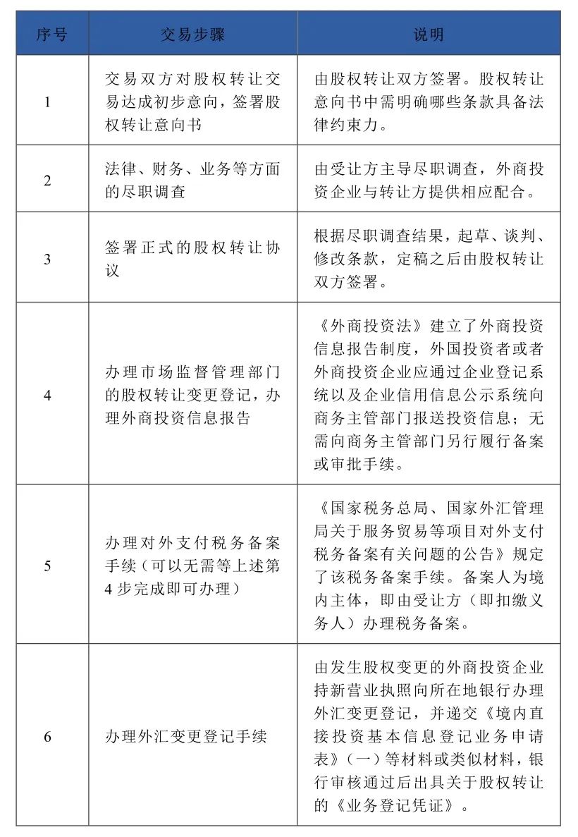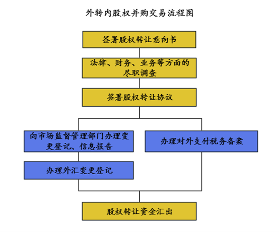 外转内项目已经是比较成熟的跨境项目,其办理流程也已较为标准化。为简化分析,我们假定外转内项目中外国投资者将其所持的外商独资企业100%股权转让给境内投资人,暂不考虑外国投资者转让外商独资企业的部分股权或转让中外合资企业的部分股权的情形。如下流程表与流程图整理了外转内的常规流程。对于可能涉及的其他监管流程,例如经营者集中审查等,本文暂且不予讨论。