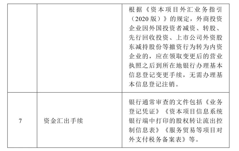 《资本项目外汇业务指引(2020年版)》还明确,外商投资企业因外国投资者减资、转股、先行回收投资、上市公司外资股东减持股份等撤资行为转为内资企业的,应在领取变更后的营业执照之后到所在地银行办理基本信息登记变更手续,无需办理基本信息登记注销。