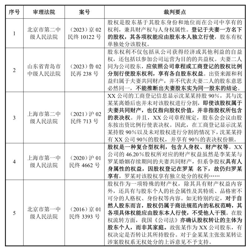 其次,对于股权的管理性权利仅限于持股一方行使,最高人民法院第二巡回法庭在2020年第3次法官会议纪要中指出,根据《公司法》规定,取得完整无瑕疵的股东资格和股东权利,应同时符合向公司出资或认缴出资这一实质要件和被记载于公司股东名册等形式要件,不能仅因出资来源于夫妻共同财产就认定该股权为夫妻共同共有;当股权登记于夫妻一方名下时,该股权的各项具体权能应由股东本人独立行使,股东有权单独处分该股权。司法裁判中也存在诸多法院得出明确的认定意见,具体如下: