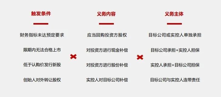 除此之外,根据对赌协议的复杂程度不同,还可能包含反稀释条款、领售权、随售权、一票否决权、优先清算权条款等。(鉴于国内司法情况,部分条款可能缺乏实践中的可履行性)