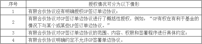 笔者赞同第二种观点。第一种观点混淆了有限合伙协议的补充协议和单边协议的区别。目前绝大多数的有限合伙协议都不包括对签署单边协议进行明确授权、限制或禁止的条款。鉴于包括有限合伙协议在内的法律文件均由GP起草,GP倾向于将签署单边协议的权限写入有限合伙协议,而且希望采取对GP更灵活的概况性的授权方式,而对LP来讲,则希望采用更明确的限制性授权方式。