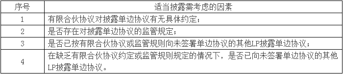 笔者赞同第二种观点。诚实信用是《合伙企业法》规定的订立合伙协议、设立合伙企业的基本原则,GP应当向全体LP适当披露与其利益有关的信息,LP对单边协议应享有知情权,GP适当披露单边协议是LP评估单边协议对其利益的影响,进而做出投资选择的基础。鉴于我国目前缺乏针对单边协议适当披露的法规规定,可在有限合伙协议中对LP的知情权范围进行具体约定,明确应当如何适当地披露有关单边协议。但披露单边协议后,如何协调和处理来自未签约或/及其他签约LP要求享受相同待遇的要求,以及如何协调各个LP的特定权利之间的冲突也是GP面临的一大课题。