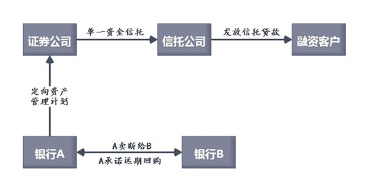 在该业务模式中,银行A欲向自己的授信客户贷款,受制于资本约束或信贷政策约束(如客户属于房地产或“两高一剩”行业的企业),于是A用自有资金或理财资金委托证券公司设立定向资产管理计划,该资产管理计划投资对象为信托公司向融资客户发放的信托贷款(非标资产)。之后,银行A将资管计划收益权卖断给银行B,同时向银行B出具收益权远期回购承诺函(抽屉协议)。