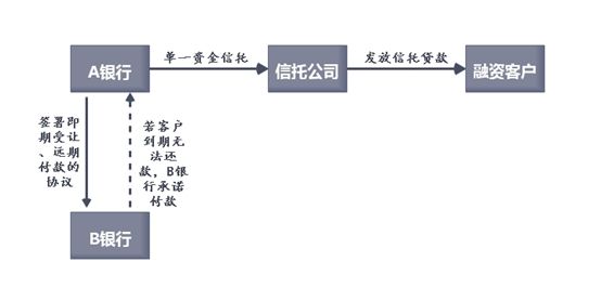 通常是B银行为了规避资本管理的监管指标,或由于信贷额度或贷款政策限制,无法直接给自己的融资客户贷款时,找来一家A银行,让A银行用自己的资金设立单一信托为企业融资。这种模式下,B银行作为风险的真正兜底方,与A签订即期受让信托受益权、远期付款的协议,若融资客户到期无法还款,B银行承诺付款。