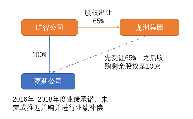 2014年11月,旷智(天津)国际贸易有限公司(以下简称“旷智公司”)与龙洲集团股份有限公司(以下简称“龙洲集团”)及天津市蔓莉卫生制品有限公司(后改名为“龙洲天和公司”,以下统一简称“蔓莉公司”)签署《投资框架协议》,约定:蔓莉公司为旷智公司的全资子公司,旷智公司自愿向龙洲集团出让其持有蔓莉公司65%的股权,旷智公司对蔓莉公司2016-2018年的业绩作出承诺,若届时无法完成业绩,龙洲集团有权推迟收购旷智公司持有蔓莉公司剩余股权,并有权要求旷智公司进行业绩补偿。