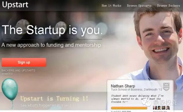 Upstart,另类的分成众筹模式(2012年4月上线,美国):Upstart是美国一家众筹平台,创始人Dave Girouard曾是Google Enterprise的总裁。Upstart有着非常独特的运营模式,资金需求者可以在平台上申请筹集资金,资金可用于偿还学生贷款、支付学费,或当作创业的启动资金。而作为回报,筹资者需要在未来10年内,每年拿出收入的7%返还给投资人。