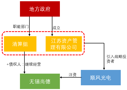 由地方政府职能部门组成的清算管理人在对无锡尚德进行调研的基础上,与债权人达成一致让企业得以继续经营。江苏省人民政府同意由无锡市国联发展(集团)有限公司作为主发起人设立江苏省资产管理有限公司。