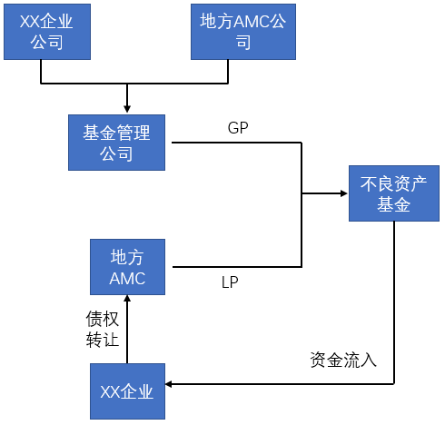 由资金周转困难的公司和资产管理公司合资成立的一般合伙人(GP),与资产管理公司共同组建不良资产处置基金,基金以筹集的资金向陷入困境的公司发放1亿元借款,专项用于其到期部分债务的替换和转贷,以及生产流动性资金支出。