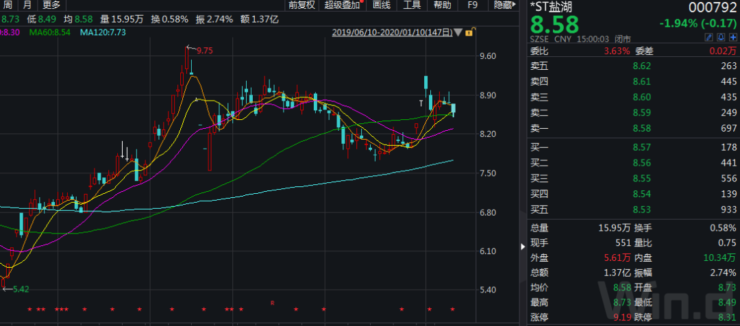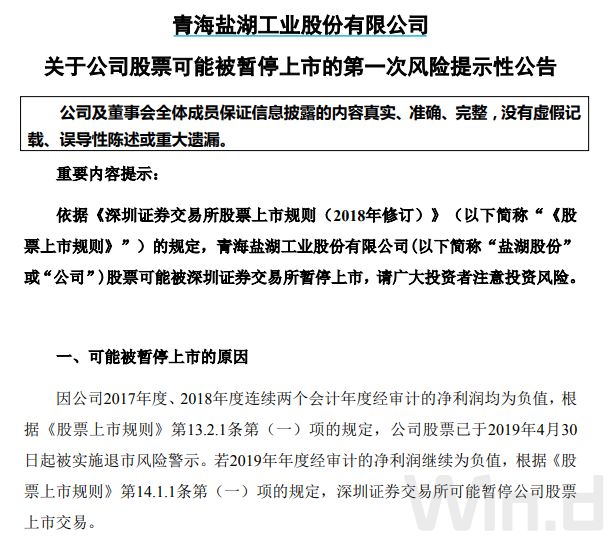 *ST盐湖已经由于2017年、2018年连续两年亏损“披星戴帽”,若2019年最终经审计的净利润为负,公司将面临暂停上市的命运。