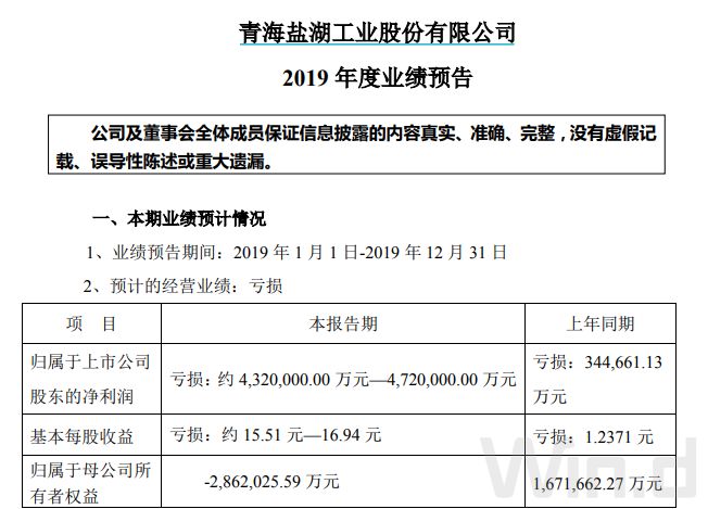 1月11日深夜,*ST盐湖发布2019年业绩预告,公司预计全年亏损金额432亿元-472亿元。而2018年,公司全年亏损金额为34.47亿元。公司预计2019年基本每股收益为亏损15.51元-16.94元,归属于母公司的所有者权益为-286.20亿元。