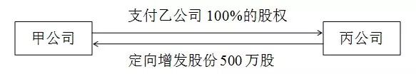 经甲、丙公司协商,甲公司将乙公司的100%的股权作价为5,000万元让与丙公司;丙公司向甲公司定向增发股票500万股,每股价格10元,作为取得乙公司100%股权的对价。