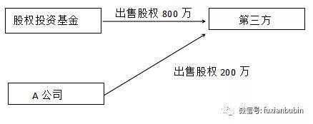 假设股权投资基金(投资方)投资A公司,若此时股权投资基金占有的股份为20%,A公司的其他股东占有的股份为80%,此时若A公司拟出售1000万股的股权给第三方,其交易结构为: