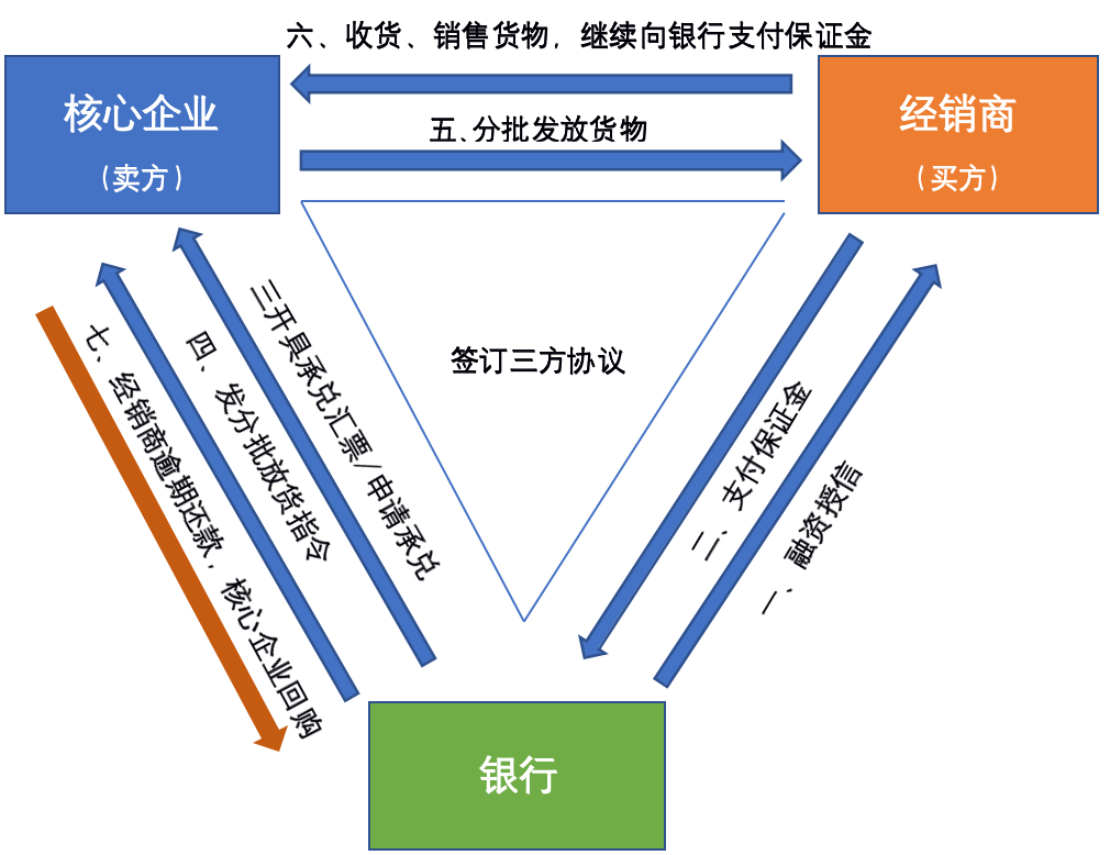 保兑仓业务模式是供应链金融业务模式中的一种,其又称为“预付款融资”,是发生在订单采购阶段供应链的下游经销商需要提前支付预付款的情况下,向银行申请融资的一种综合业务模式。2015年,最高人民法院在《最高人民法院关于当前商事审判工作中的若干具体问题》对保兑仓业务模式、纠纷处理规则方面首次作出回应,2019年,最高人民法院发布《全国法院民事审判工作会议纪要》(简称“九民纪要”)》对保兑仓业务重新给予关注,其认为:“保兑仓交易作为一种新类型融资担保方式,其基本交易模式是,以银行信用为载体、以银行承兑汇票为结算工具、由银行控制货权、卖方(或者仓储方)受托保管货物并以承兑汇票与保证金之间的差额作为担保。其基本的交易流程是:卖方、买方和银行订立三方合作协议,其中买方向银行缴存一定比例的承兑保证金,银行向买方签发以卖方为收款人的银行承兑汇票,买方将银行承兑汇票交付卖方作为货款,银行根据买方缴纳的保证金的一定比例向卖方签发提货单,卖方根据提货单向买方交付对应金额的货物,买方销售货物后,将货款再缴存为保证金。”